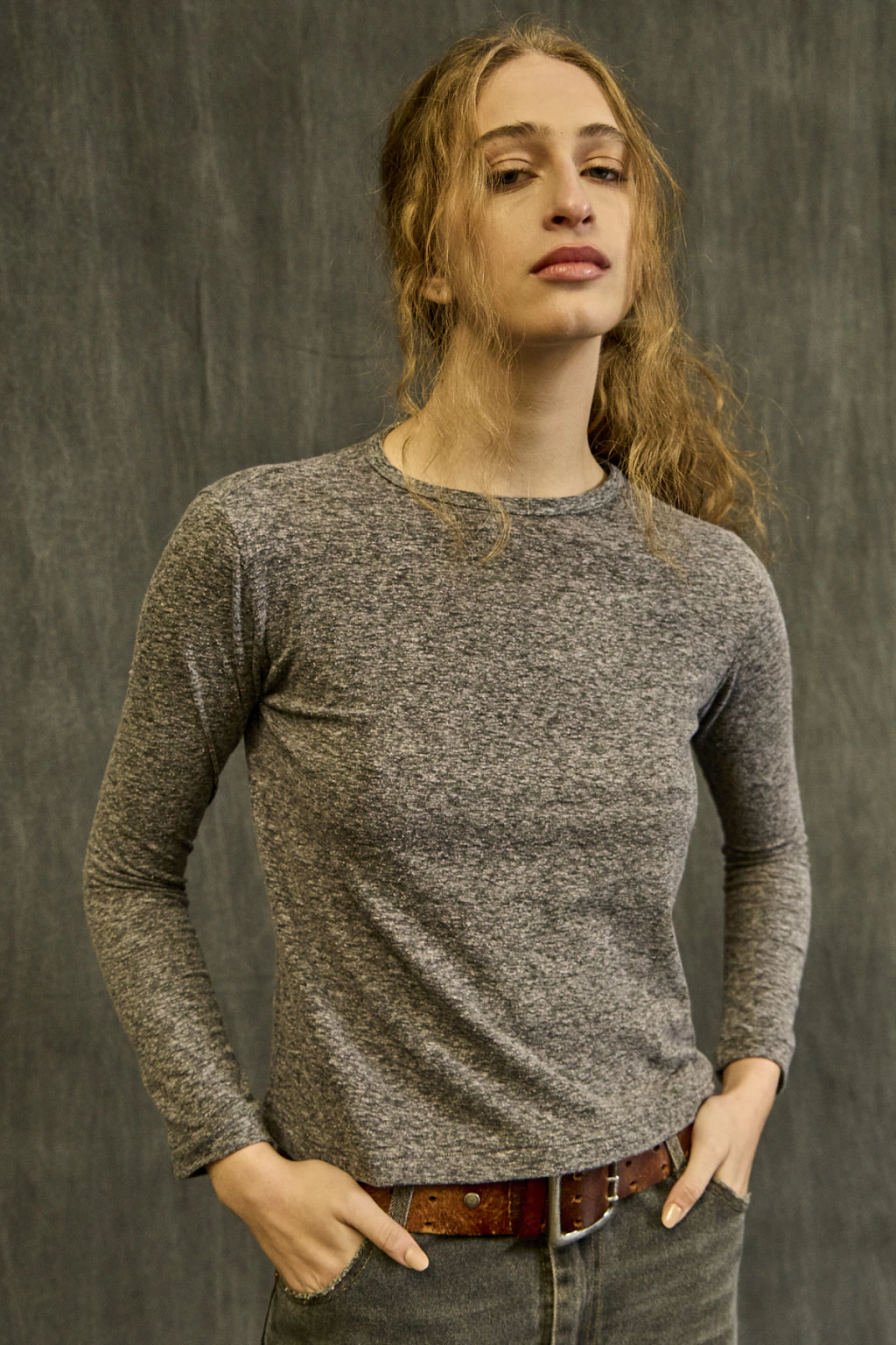 Remera manga larga sin sisas, escote “V”, de jersey tejido. Recorte en laterales con uniones pisadas con bordador. Recorte en centro delantero y espalda. Costura india en ruedo y puños.